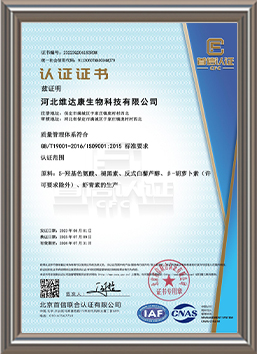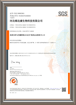 作为质量管理实力的权威见证,维达康已通过全球范围内多项严苛的资质认证,标志着企业质量保证能力达到国际一流水准。认证体系全面覆盖质量管理、食品安全、合规运营等核心领域,具体包括:现行良好生产规范(CGMP)认证、美国食品药品监督管理局(FDA)食品安全现代化法案(FSMA)认证,以及FSSC22000、IS022000、BRC、HACCP 四大食品安全生产与质量管控体系认证,构筑食品安全核心防线,通过ISO9001 质量管理体系认证,彰显企业标准化、规范化管理实力;同时斩获 Kosher(犹太洁食)、Halal(清真)认证,精准满足不同宗教信仰与饮食文化的市场需求;通过SeIf-GRAS(公认安全)自我认定,进一步验证了产品的安全性、合规性与市场适配性。