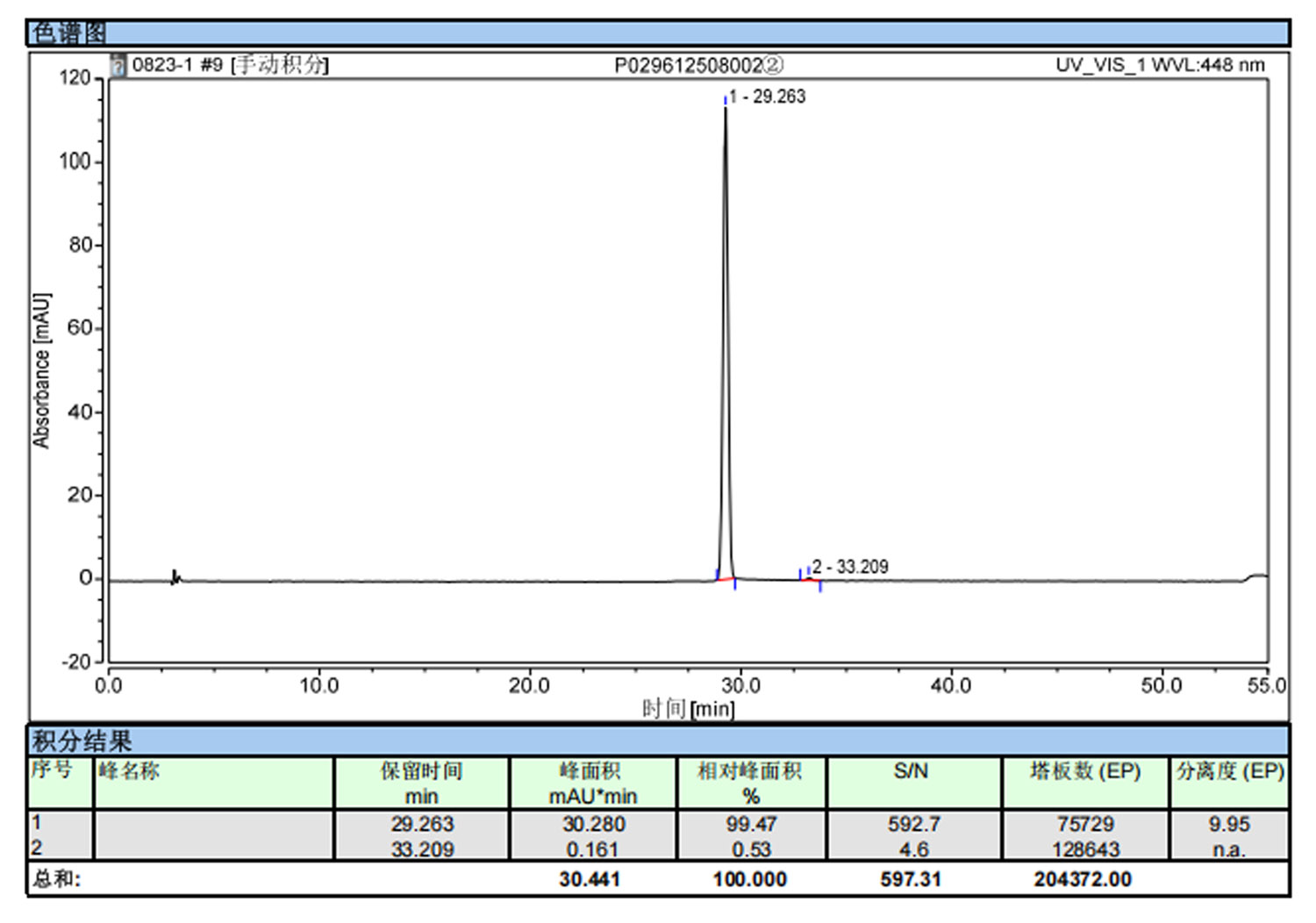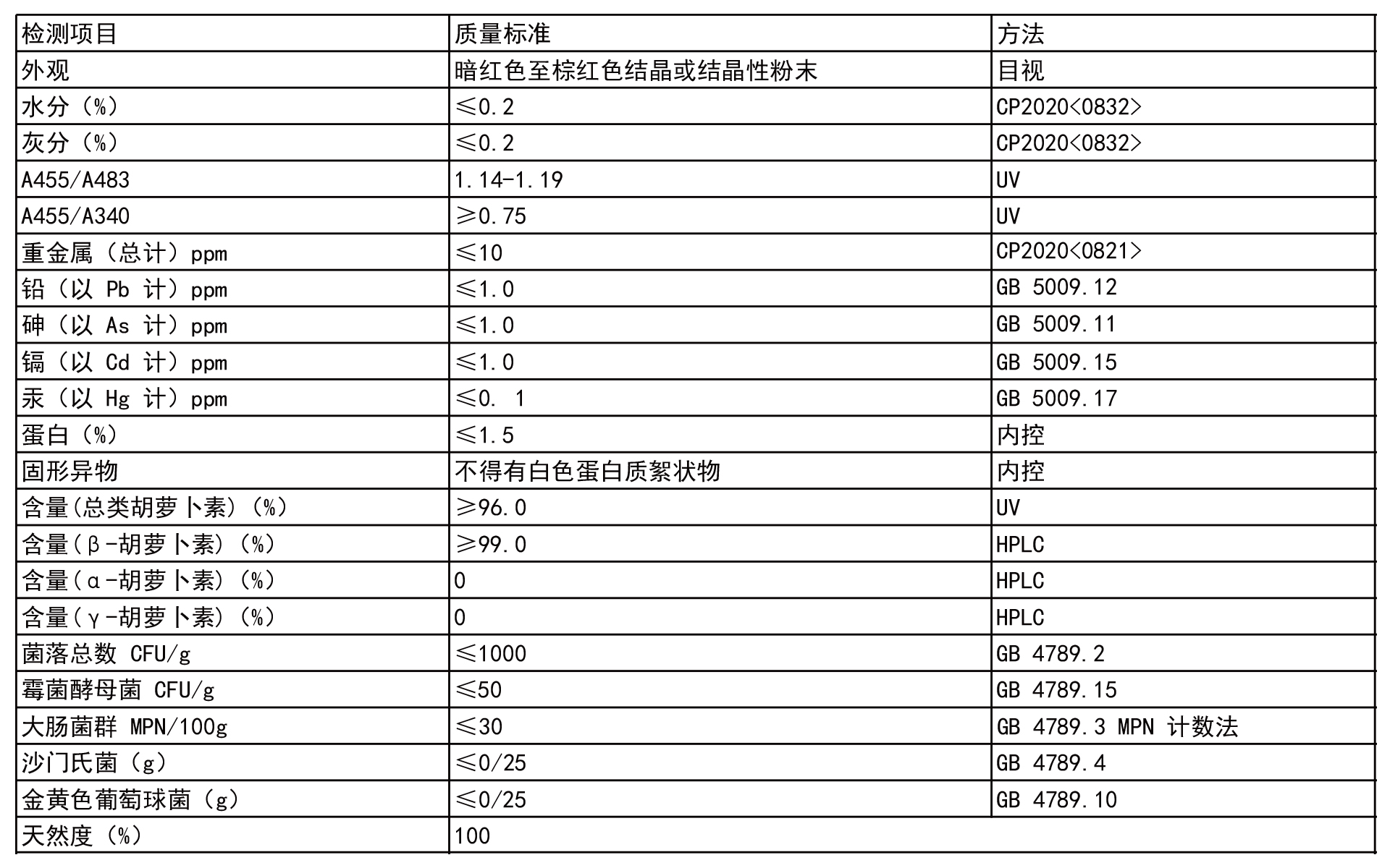 使用FDA批准的安全菌株,β-胡萝卜素含量>99.0%,且不含α-胡萝卜素及γ-胡萝卜素,符合食品、化妆品及饲料等高端应用标准;
