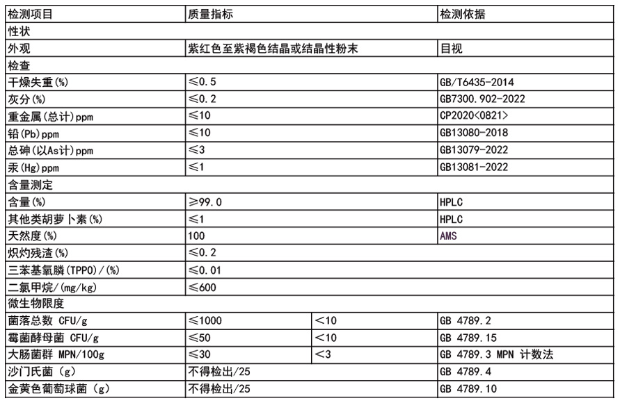 以超纯β-胡萝卜素为起始底物,采用高专一性固定化酶催化技术定向合成,酶制剂可重复利用,生产周期缩短30%以上;全程无冗余杂质生成,分离纯化效率更高,终产品纯度稳定>99.0%。相较于传统直接发酵工艺,成本优势显著且同步布局合规化合工艺,精准匹配不同地区法规标准,适配多元应用场景。