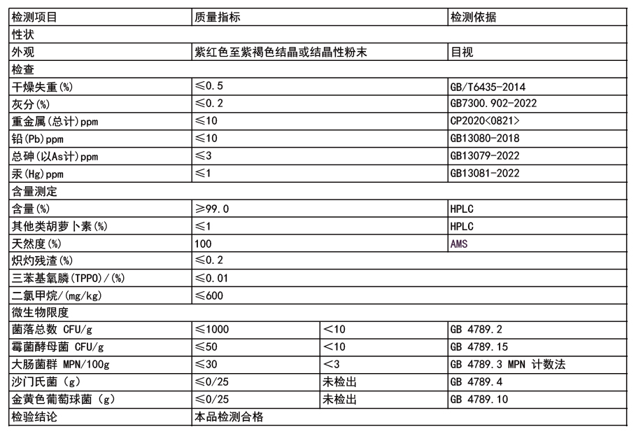 以超纯β-胡萝卜素为起始底物,采用高专一性固定化酶催化技术定向合成,酶制剂可重复利用,生产周期缩短30%以上;全程无冗余杂质生成,分离纯化效率更高,终产品纯度稳定>99.0%。相较于传统直接发酵工艺,成本优势显著且同步布局合规化合工艺,精准匹配不同地区法规标准,适配多元应用场景。
